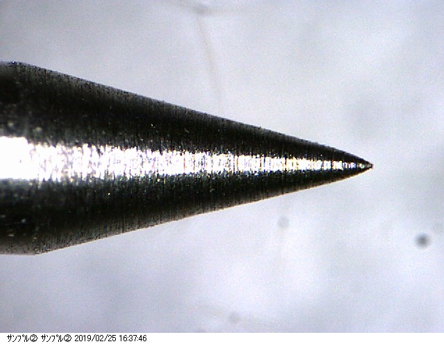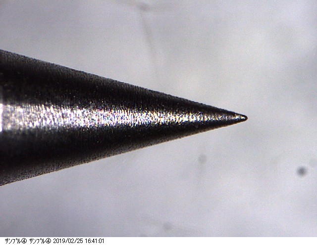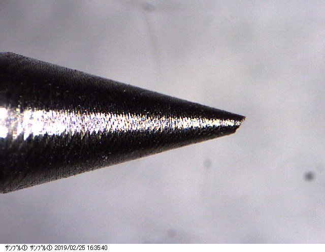 その後、研磨加工の試作トライアルを行ったのでその進捗状況を紹介したいと思います。加工するタングステンの径はφ0.3~φ3.0くらいまでのサイズがあり、これから紹介する写真は中間ぐらいのサイズ径の加工品になります。