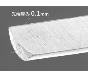 先端に向かって研削加工を施し、先端部はわずかt0.1mmに仕上げています。